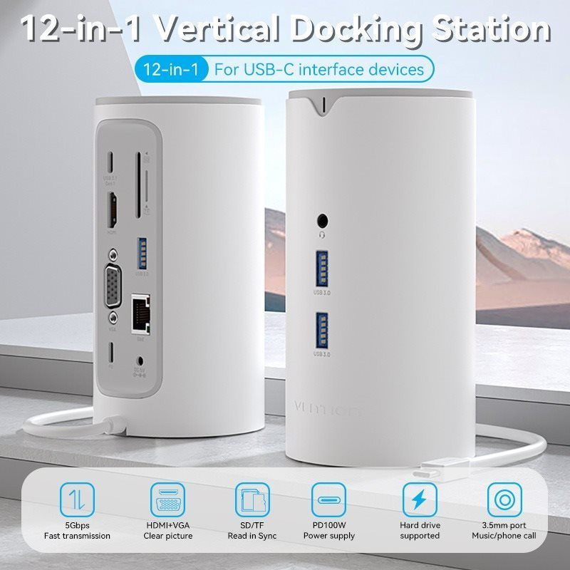 Vention USB-C -> HDMI/VGA/USB 3.1 Gen 1-C/USB 3.0x3/RJ45/SD/TF/TRRS 3.5mm/PD/DC, 0.25M, dokkoló